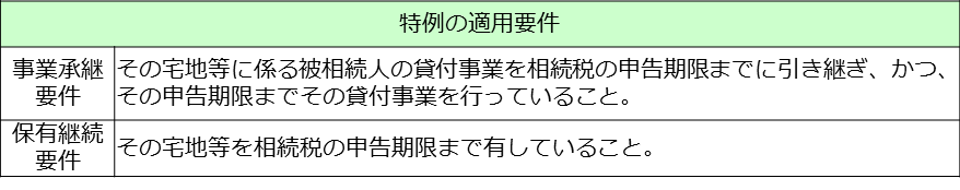 小規模宅地等の特例の貸付事業用宅地等について、原則相続開始前3年以内に貸し付けを始めたものはその対象から除外されることとなりますが、上記の基準を満たす場合を「特定貸付事業」として、その3年以内に貸し付けたものも対象となる例外措置が設けられています。