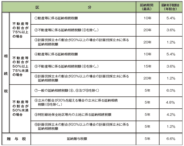 相続した財産のうちに占める不動産等の割合が何%かで、延納期間・延納利子税の割合が大きく異なります。